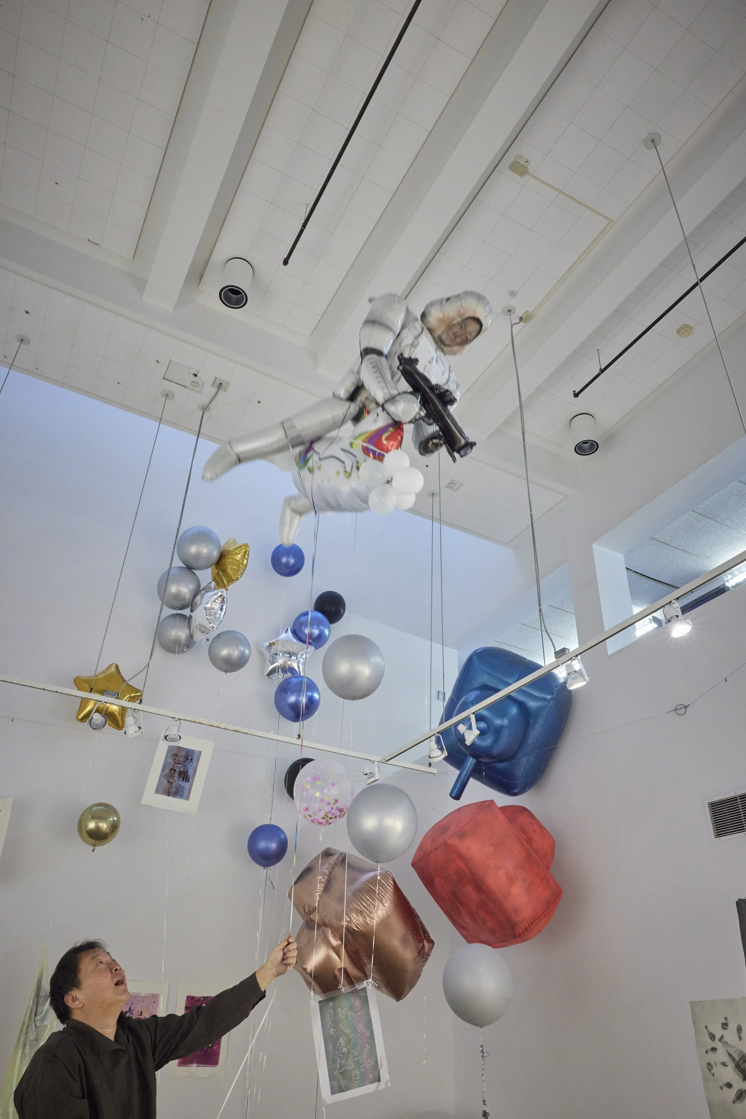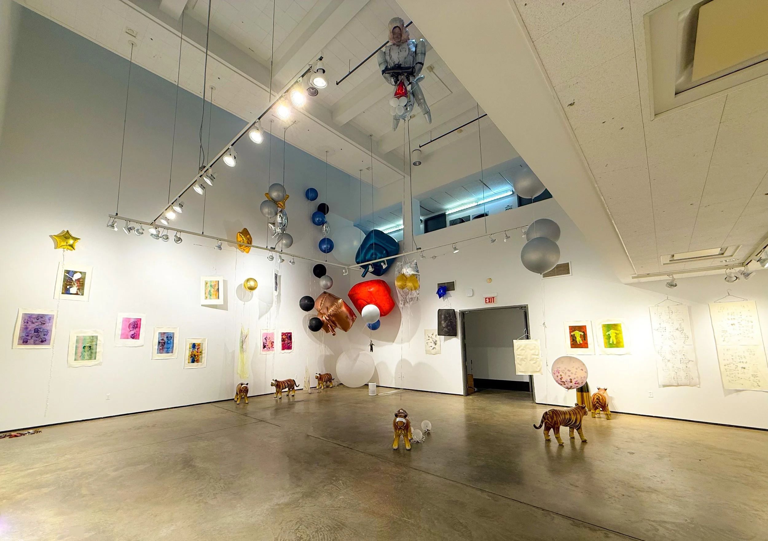 This series of monotypes and site-specific installations uses air as both material and metaphor to explore militarism, memory, and desire. Balloons—simultaneously playful and volatile—are inflated, pressed, and exploded beneath dark blankets, transforming air into a mark-making force. The resulting prints, made through graphite transfer, capture ruptured folds, smudges, and abstract impressions that echo military uniforms, Korean iconography, phallic symbols, and grenades. Suspended by balloons, the prints hover in space, suggesting both levity and burden, as if lifted by breath and haunted by history. Drawing from a personal background shaped by South Korea’s entanglement with American military power, the work investigates the visibility of trauma, the intimacy of pressure, and the spectral presence of neocolonial influence—where the body, like air, is compressed, released, and inscribed into surface.